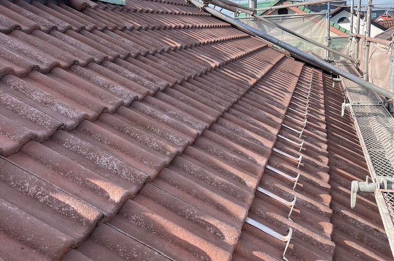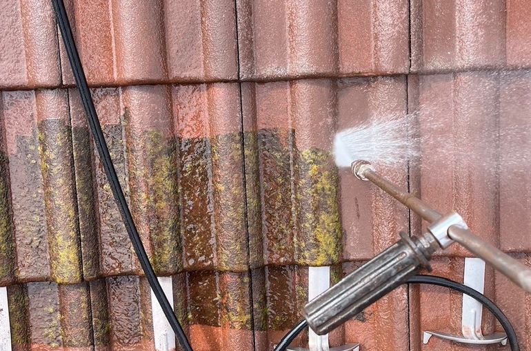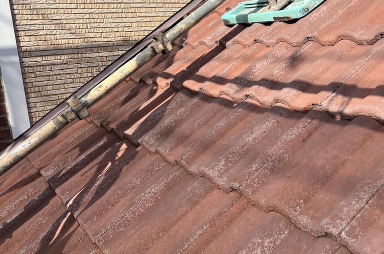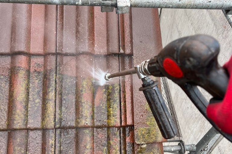 モニエル瓦の塗装前に、高圧洗浄で劣化した表面のスラリー層をしっかり取り除いていきます!
